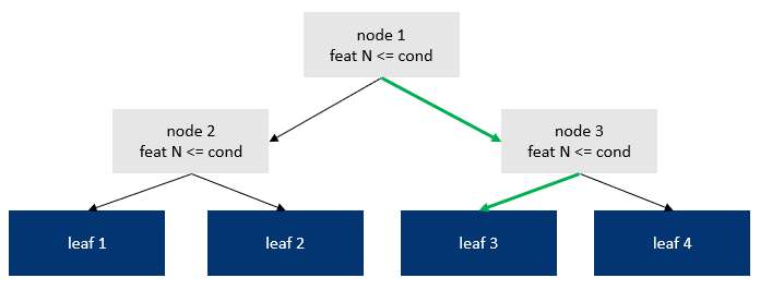 Highlighted in green is the decision path taken for a given sample. It goes into depth number of binary decisions, resulting in the path node1 → node3 → leaf3.