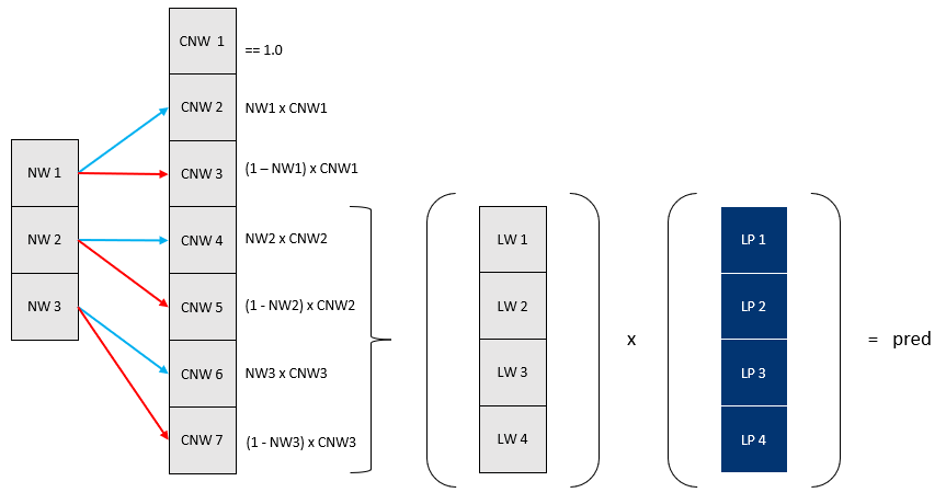 By relaxing these hard conditions into soft ones, the mask takes the form of a probability vector associated to each leaf, where ∑(leaf_weights) = 1 and where each each leaf_weight element is [0, 1]. A tree prediction can be obtained with the dot product: leaf_values' * leaf_weights.